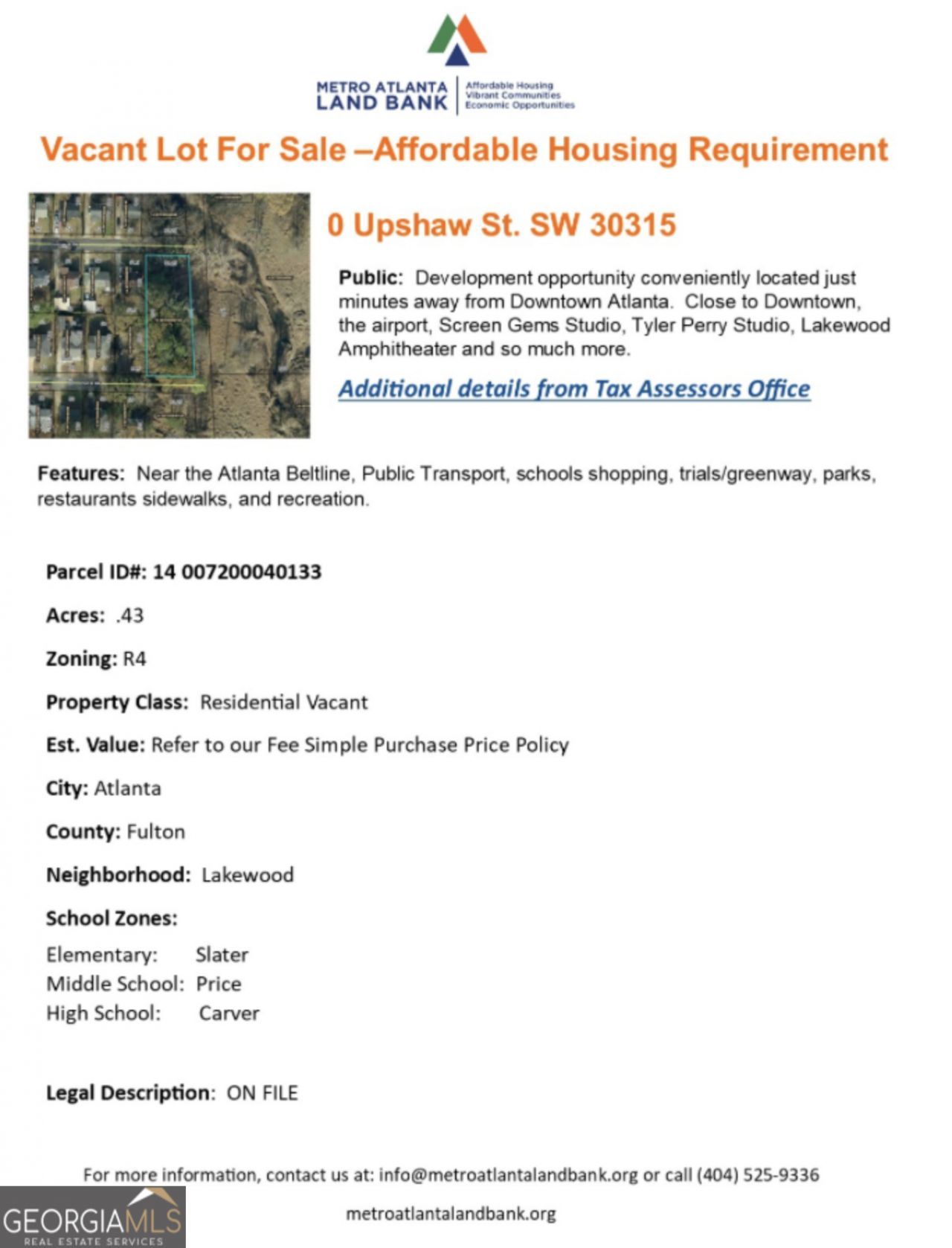0 Upshaw Street presents a strong opportunity for builders and developers seeking a well-located infill lot in an established Atlanta neighborhood. The parcel offers flexibility for residential construction and is surrounded by existing homes and ongoing development. The site's location provides convenient access to major corridors, employment centers, and neighborhood amenities, making it well-suited for new construction aimed at today's buyer or rental market. This lot offers an efficient footprint for a single-family or small-scale residential build, subject to zoning and municipal requirements. Property is being sold as vacant land. No Seller's Property Disclosure is provided. Buyers are encouraged to conduct all due diligence regarding zoning, utilities, setbacks, and development feasibility.