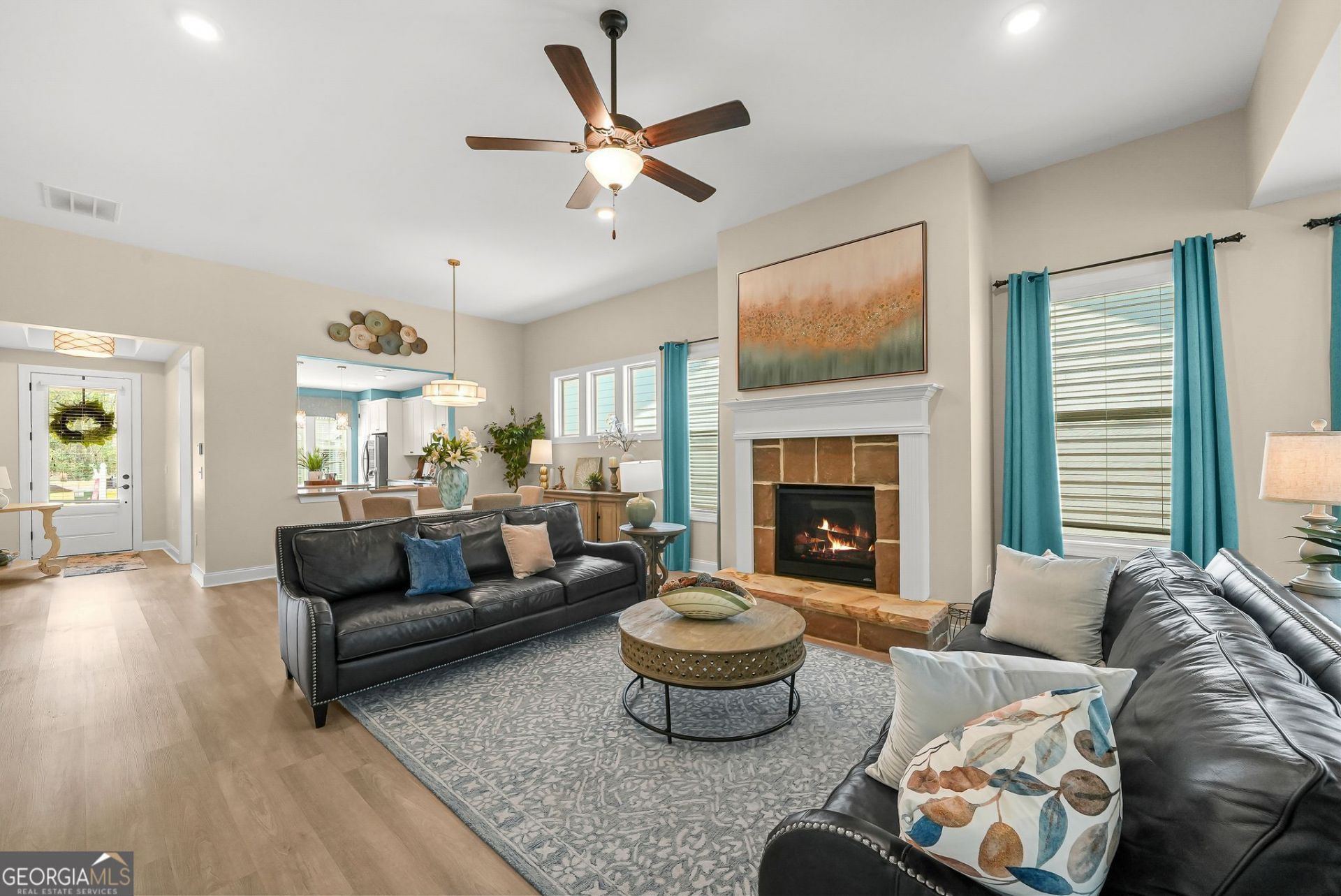New carpet, fresh paint, MOVE IN READY!! - furniture may be purchased as well! Welcome to the highly sought-after Cresswind Peachtree City 55+ community, where refined comfort meets effortless, active living and direct access to Peachtree City's renowned 100+ miles of golf cart paths. From the moment you enter this home, a welcoming foyer flows seamlessly into the heart of the home, opening into a sunlit open-concept floor plan designed for both easy everyday living and meaningful gatherings. The spacious great room offers a warm, inviting setting for entertaining family and friends, while the airy kitchen features a convenient central island, stainless steel appliances, a breakfast nook, comfortable dining space, and a charming pass-through window over the sink that keeps you engaged with guests in the great room. Freshly painted walls, new carpet, and luxury vinyl plank flooring throughout the main living areas add to the home's polished, like-new appeal. Tucked away for privacy, the owner's suite offers a peaceful retreat with two walk-in closets, separate vanities, and a spa-inspired bath designed for comfort and ease. Step outside and enjoy the beauty of a spacious enclosed lanai along with a covered 8-foot patio spanning the full width of the home, already paved and ready for outdoor enjoyment or even a future hot tub. Cozy evenings come easy with the Heatilator fireplace with Real Fyre premium gas logs, which also offers the rare flexibility to convert to wood-burning if desired. This home also includes a tankless water heater and spray foam insulation in the attic. Beyond the home itself, Cresswind delivers an award-winning resort-style active adult lifestyle with resident-only clubhouse, swim, pickleball courts, tennis courts, walking and hiking trails, a fitness center, arts and crafts room, demonstration kitchen, indoor and outdoor social spaces, and clubs for every hobby. Residents also enjoy a charming community garden with personal harvest boxes. Ideally situated in the heart of Peachtree City, this home invites you into a lifestyle connecting you not only to shopping, dining, lakes, and everyday conveniences, but also alongside beloved local courses such as Flat Creek Country Club, Braelinn Golf Club, and Planterra Ridge Golf Club. Whether heading out for dinner, a morning ride by the water, or a round of golf, this one-of-a-kind path system offers a level of access and ease that sets Peachtree City apart. With HOA-maintained landscaping, nationally recognized amenities, and one of metro Atlanta's most celebrated 55+ lifestyles, this is more than a just-listed home-it's a place where life slows down just enough for you to truly enjoy it.