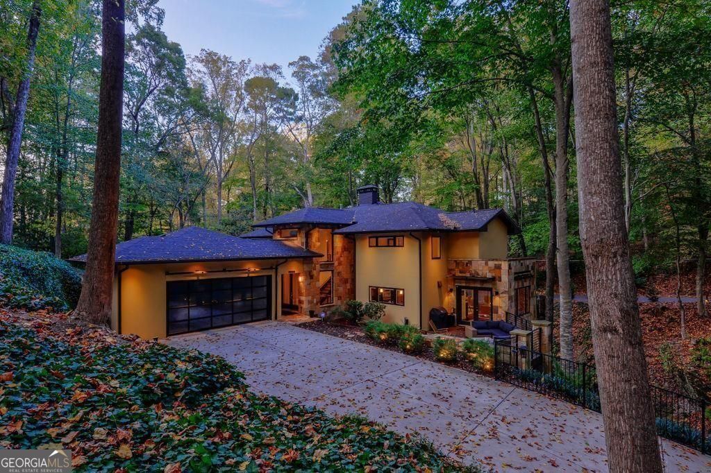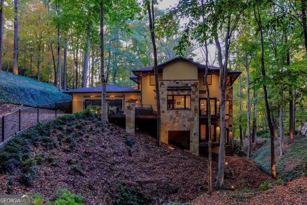 Hidden within one of Buckhead's most coveted enclaves-and positioned in one of Atlanta's most prestigious zip codes-this Frank Lloyd Wright-inspired architectural masterpiece delivers a sense of serenity within the city. Nestled behind private gates on a secluded, wooded acre, the residence evokes the feel of a modern mountain retreat while remaining just minutes from Buckhead's world class dining, luxury shopping, and effortless access to I 75. Reimagined and completely rebuilt in 2012 by award winning Epic Development-recipient of more than nine OBIE Awards-this six bedroom, four and a half bath residence embodies harmony, flow, and a deep connection to nature across three meticulously crafted levels. The result is a home that blends timeless architectural design with contemporary luxury . A dramatic foyer with soaring ceilings sets the tone, leading into a breathtaking family room wrapped in floor to ceiling glass. Sunlight pours in, framing serene views of the expansive outdoor landscape and the tranquil creek that winds through the property. The living room, anchored by a gas fireplace, offers a warm retreat-an escape that feels worlds away from the city yet remains moments from Buckhead's conveniences. The chef's kitchen overlooks the wooded surroundings and is bathed in natural light. It features a gas cooktop, double ovens, custom wood cabinetry, and marble countertops. A generous island flows seamlessly into the dining area, while the adjacent breakfast room opens to multiple decks. Here, a built in gas firepit creates a stunning backdrop for year round entertaining. A main level guest suite with ensuite bath provides ideal accommodations for multigenerational living, complemented by a separate powder room and a dedicated laundry room. Upstairs, the primary suite is a private retreat with a custom walk in closet and a spa caliber bathroom featuring a freestanding soaking tub, double vanities, and a separate shower. Two additional bedrooms share a beautifully designed bathroom on this level. The rooftop living deck elevates outdoor living-literally and figuratively. Covered, private, and complete with its own fireplace and wet bar, this treetop sanctuary offers year round relaxation for unforgettable entertaining. The terrace level expands the home's versatility with a spacious open living area, two additional bedrooms, a full bath, a wine cellar, and abundant storage. Every level showcases thoughtful design, unique architectural details, and an unwavering commitment to quality. A residence of this caliber-architectural, distinctive, and truly one of a kind-is a rarity in Buckhead. This is more than a home; it is a retreat, a statement, and a lifestyle unlike anything else on the market.