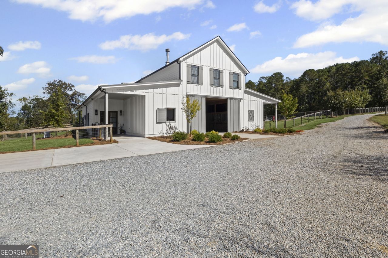 BEAUTIFUL CUSTOM HOME AND EQUESTRIAN PROPERTY SITTING ON A TRANQUIL 34.36 +/- ACRES On Bear Creek Bordering Bear Creek Hunt Club. Home was meticulously remodeled in 2023 and features white oak hardwood floors, twelve-foot ceiling downstairs, elevator, new Pella windows, custom trim, custom cabinets. Two story foyer, bonus room/flex space, laundry room, large storage closet, with wood shelving, on lower level. Upper-level features spacious living room and dining room with wood-burning fireplace and fantastic built-ins. Kitchen has quartz counters, large island, stainless steel appliances with two dishwashers, pantry. Both the guest bedroom and master bedroom feature a walk out deck with breathtaking views. Third bedroom could be an office or nursery as well. Master bath has walk-in tiled shower, double vanity, walk-in closet with laundry room, built-ins, pocket doors, access to elevator. Acreage is fenced and cross-fenced. Nice road system and gates. Potential pond sites on property. The horse barn and home feature seven 12x14 stalls with mats all with rear dutch doors to paddocks. New 120x188 riding arena with M10 footing. Established pastures with Bermuda grass. Second 40x60 two-story barn with roll up doors. Three chicken coops, two turkey coops, two pig run-in sheds with four pastures. Enjoy the peace and quiet of the country with Hartsfield-Jackson International Airport access in just 45 minutes.