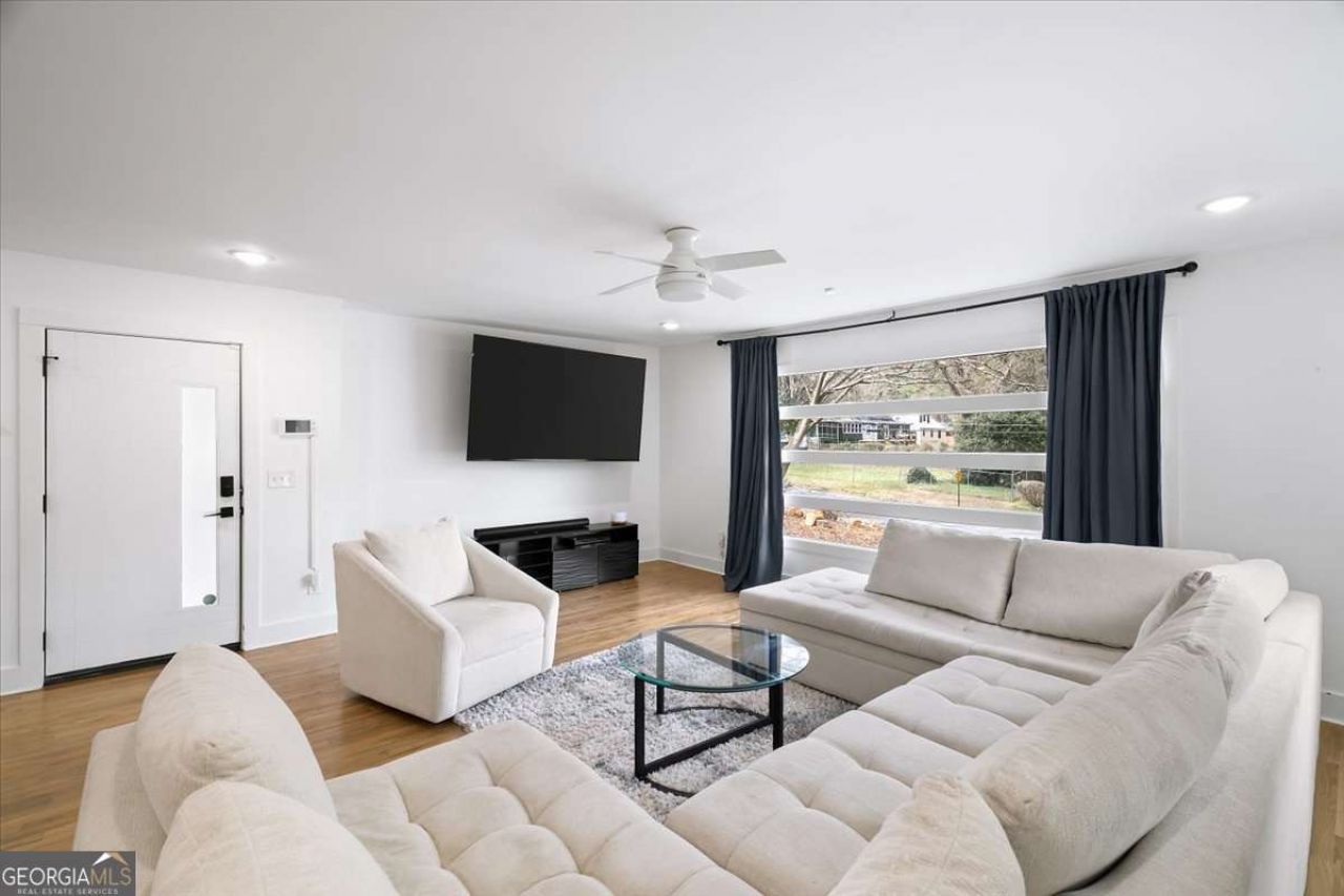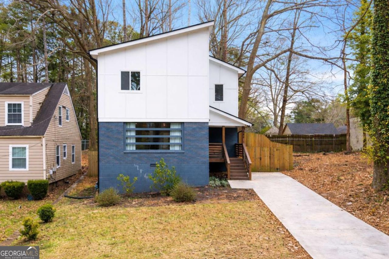 1846 Rogers Avenue is a contemporary residence in Atlanta's Westwood Terrace neighborhood offering bright, thoughtfully designed living with modern finishes and a functional layout. Reconstructed in 2022, expansive windows and hardwood floors fill the main level with natural light, where the open kitchen features quartz countertops, shaker cabinetry, stainless steel appliances, and a large island flowing into the living and dining areas. A bedroom and full bath on the main level provide flexible space for guests or office use, and a wooded backdrop enhances privacy. Upstairs, the primary suite includes a spa-style bath with freestanding soaking tub, glass-enclosed shower, dual vanity, custom walk-in closet system, and private balcony. Two additional bedrooms share a Jack-and-Jill bath. Outdoor living includes a deck and yard space ideal for relaxing or entertaining. Smart-home features, security system, and remaining warranty provide added convenience. Located minutes from the BeltLine Westside Trail, Lee + White, Westview, and Westview Corner Grocery, with convenient access to Downtown, Midtown, and the airport, this home offers contemporary design and in-town connectivity in a growing Westside location.