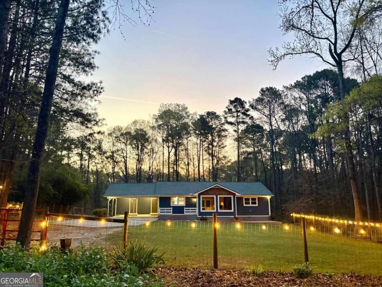 Honey stop the car! This farmhouse chic ranch sits on nearly three private wooded acres just minutes from Senoia and Peachtree City and is located in the highly sought after Sara Harp Minter, Whitewater Middle, and Whitewater High school district. Tucked away at the end of a private drive, the home offers a peaceful setting with a beautifully fenced front yard featuring blackberry bushes and encore azaleas, along with a dedicated fire pit area perfect for enjoying cool evenings with friends and family, enhanced by installed landscape lighting. The expansive backyard provides endless opportunities to garden, play, or enjoy fresh eggs from the custom built chicken coop, and includes raised, preestablished garden beds ideal for organic gardening and growing fruits and vegetables, along with additional berry bushes throughout the property for easy picking and fresh enjoyment. A wooded area with walking and bike trails adds to the charm of this expansive property. The home has been thoughtfully updated with new siding, a new roof, newer HVAC system, fresh paint, and a brand new water heater. Inside you will find an oversized living and dining area with original hardwood floors, an updated farmhouse style kitchen, and a conveniently located laundry room. The layout includes three bedrooms and two bathrooms in a roommate style plan. Step outside the French doors to a stunning screened porch with vaulted wood ceilings, ideal for relaxing and taking in the serene surroundings. This idyllic property has been in the family for generations and showcases pride of ownership, love and attention to the smallest details throughout. It is truly a rare find.