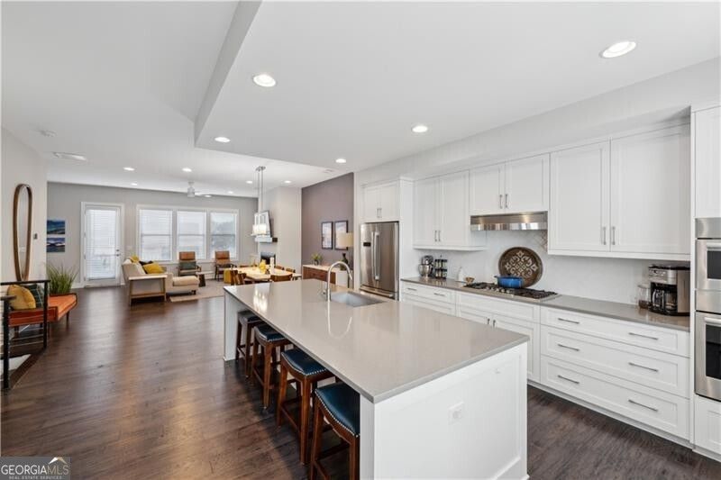 This stunning, like-new Kirkwood townhouse has been meticulously maintained by its original owners (no pets, never rented). With 4 bedrooms and 3 1/2 bathrooms, this gem offers the perfect blend of luxury and comfort with plenty of space for a guest room and home office. Step inside and discover an inviting open-concept floor plan featuring dark hardwood floors and crisp white cabinetry, creating a timeless aesthetic. High ceilings and abundant windows flood the home with natural light. You will definitely appreciate the upgraded details like the Bosch appliances package and custom blinds throughout. This home offers great walkability with close proximity to Little 5 Points, downtown Kirkwood, East Atlanta Village, Decatur, Oakhurst, Pullman yards, and the Eastside beltline. The floor plan offers great flexibility with the 4th bedroom on the lower level offering your visiting guests complete privacy away from the other bedrooms. In addition, there is a patio off the lower level offering a great place for your guests to walk out and enjoy. The top floor which features a very spacious primary suite plus spa-style bath is very private in that it does not share any common walls with the other secondary bedrooms located on the top floor. There is a full laundry room on the top floor. The spacious gourmet kitchen with the crisp white cabinetry is truly the center point of the main level. With its open concept, the gourmet kitchen is directly open to the formal dining area offering great entertaining options. The great room is incredibly spacious and features the popular modern rectangular fireplace with gas logs and changing colors - a true focal point. Enjoy the pleasant spring and fall mornings and evenings by opening the French door leading from the great room to the exterior balcony. Hardwood floors are found throughout the main level and in the common areas both upstairs and on the lower level. There truly is a room for every need. Do not let this wonderful, like-new property get away.