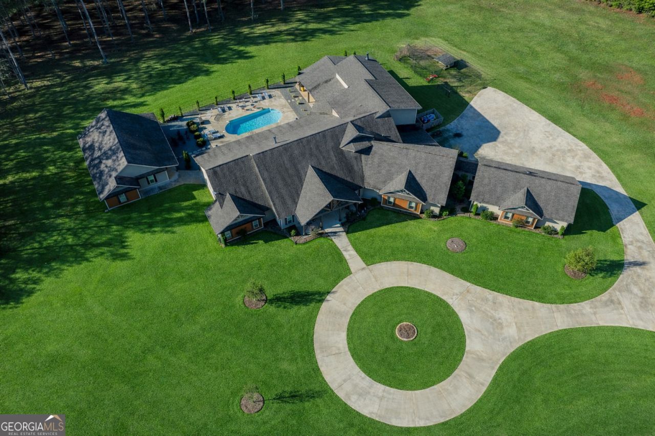 Welcome to this breathtaking 5 bedroom, 4.5 bath estate offering an impressive 7,670+/- sq ft of refined living space, perfectly situated on 33.157+/- pristine acres in highly desirable Coweta County. This remarkable property blends luxury, comfort, and privacy - ideal for entertaining, multi-generational living, or creating your own private retreat. Step inside to an open floor plan with soaring ceilings and expansive living spaces designed to impress. The chef's kitchen is truly the heart of the home, featuring a massive kitchen island, granite countertops, multiple sinks, abundant cabinetry, and an oversized walk-in pantry - perfect for hosting gatherings large or small. The main level includes three spacious bedrooms, each offering its own private full bath and walk-in closet, providing exceptional comfort and privacy. The home features two separate living room areas, both enhanced by gas fireplaces, creating warm and inviting spaces for relaxation and entertaining. Upstairs, you'll find two additional bedrooms and a full bath, along with a versatile loft area. An attic provides ample storage, adding even more functionality to this thoughtfully designed home. The property also boasts a 4-car garage along with a large parking pad, offering ample space for vehicles, guests, and recreational equipment. Outdoor living is just as spectacular. Enjoy the 1,530+/- sq ft pool house, complete with a kitchen and half bath, plus a dedicated theater room and a separate space currently used as a weight room, offering incredible flexibility for entertainment, fitness, or additional gathering space. The in-ground saltwater pool is complemented by an oversized back patio with a gas fireplace, providing stunning views of the rolling acreage and creating the perfect setting for year-round enjoyment. Additional features include a mansard-style barn measuring 30' deep x 26' wide x 18' tall, set on a poured concrete slab. The structure also features two 12-foot-wide carports, one on each side, providing excellent covered parking or equipment storage. The building includes four windows for natural light, a roll-up garage door for large access, and a convenient side entry door with a digital keypad access for easy, secure entry. The property also benefits from two separate entrances, offering added accessibility and flexibility for vehicles, equipment, or guests. The expansive acreage offers endless possibilities - whether for recreation, privacy, or future expansion. This truly one-of-a-kind property offers the rare combination of luxury living, exceptional amenities, and unmatched acreage - an extraordinary opportunity in Coweta County.