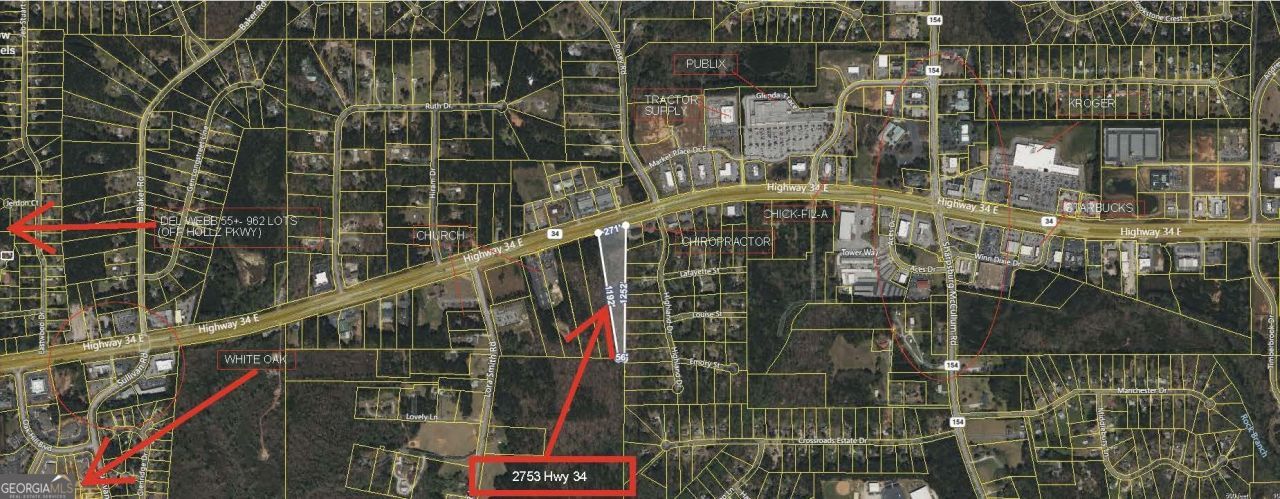 4.628 acres of Commercial land with over 259 ft of road frontage on widely traveled Hwy 34 in the Thomas Crossroads area of Newnan. Traffic count study estimates 37,000+ vehicles passing daily. Curb cut at Highland accommodates East / West traffic and an existing asphalt driveway directly off of Hwy 34 accommodates East traffic. Water and Sewer. Topo and survey attached to listing. Lot is elevated above street level for great visibility. Zoning is C, overlay for office park use, with medical office buildings and an additional unimproved 10 acre tract immediately adjacent and retail and law offices east of Highland Dr.