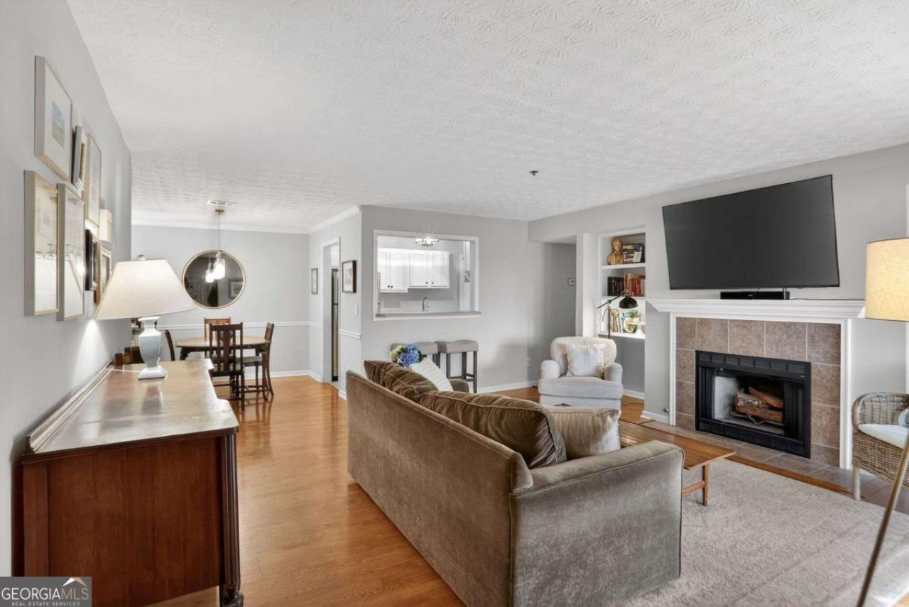 Welcome to this beautifully maintained 2-bedroom, 2-bath condo in the gated community, perfectly situated just minutes from the best of Vinings, Smyrna, Midtown, Buckhead, and more. Comfortable living space, this move-in ready home offers the ideal blend of convenience, privacy, and charm. Inside, you'll love the functional split-bedroom floor plan-perfect for roommates, guests, or a private home office setup. The bright and airy main living area features hardwood floors, a cozy fireplace, and an open flow between the living room, dining space, and kitchen. Natural light pours in, and the added sunroom makes a perfect office, reading nook, or bonus sitting area. Step out onto your private balcony and enjoy peaceful views with no neighbors directly behind you. The spacious primary suite offers generous closet space and a private bath, while the secondary bedroom also features ample storage and its own full bath. A new washer and dryer add convenience, and the community recently completed major exterior updates, including new siding and fresh exterior paint in 2025, enhancing both value and curb appeal. Short drive to The Battery Atlanta & Truist Park. Historic Vinings Village. Cumberland Mall & surrounding retail. Easy access to I-285 and I-75 for seamless commuting. Nearby parks, trails, and green space including access to the Silver Comet Trail.