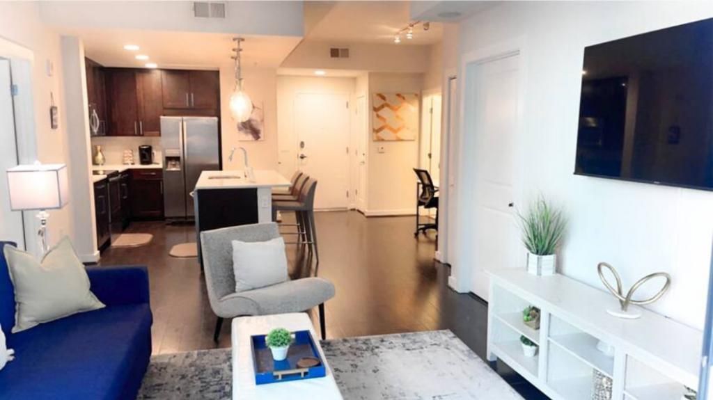 Fully furnished modern 2 bed/2 bath private corporate apartment with walk-out balcony located on the 11th floor in a beautiful high-rise community in the prestigious upscale area of Buckhead, Atlanta. The corporate suite offers a spacious roommate floorplan with great amenities and essentials for a pleasant and memorable stay. All utilities included. No smoking, pets, or parties. AMENITIES INCLUDED: 3 Flat-screen 4K Smart HDTVas with the latest streaming apps, free internet/Wi-Fi, Master bedroom with a king bed and in-suite master bathroom, guest bedroom with a queen-size bed, walk-in closets, smart lock, fully equipped kitchen with stainless steel appliances, granite countertop, in-suite washer & dryer, city and pool view from the walkout balcony, bed linens, towels and much more. COMMUNITY AMENITIES: Concierge service, City views, 24-hour fitness center, rooftop swimming pool, clubhouse with kitchenette, outdoor lounge areas, outdoor grills, outdoor fire pit, outdoor dining, secured covered parking garage, business center with work areas equipped with public computers and much more. OTHER COMMUNITY AMENITIES: Buckhead Marta Train Station, Lenox Mall, Phipps Plaza, entertainment, grocery stores, medical facilities, beauty shops, great restaurants and rooftop lounges are within walking distance.