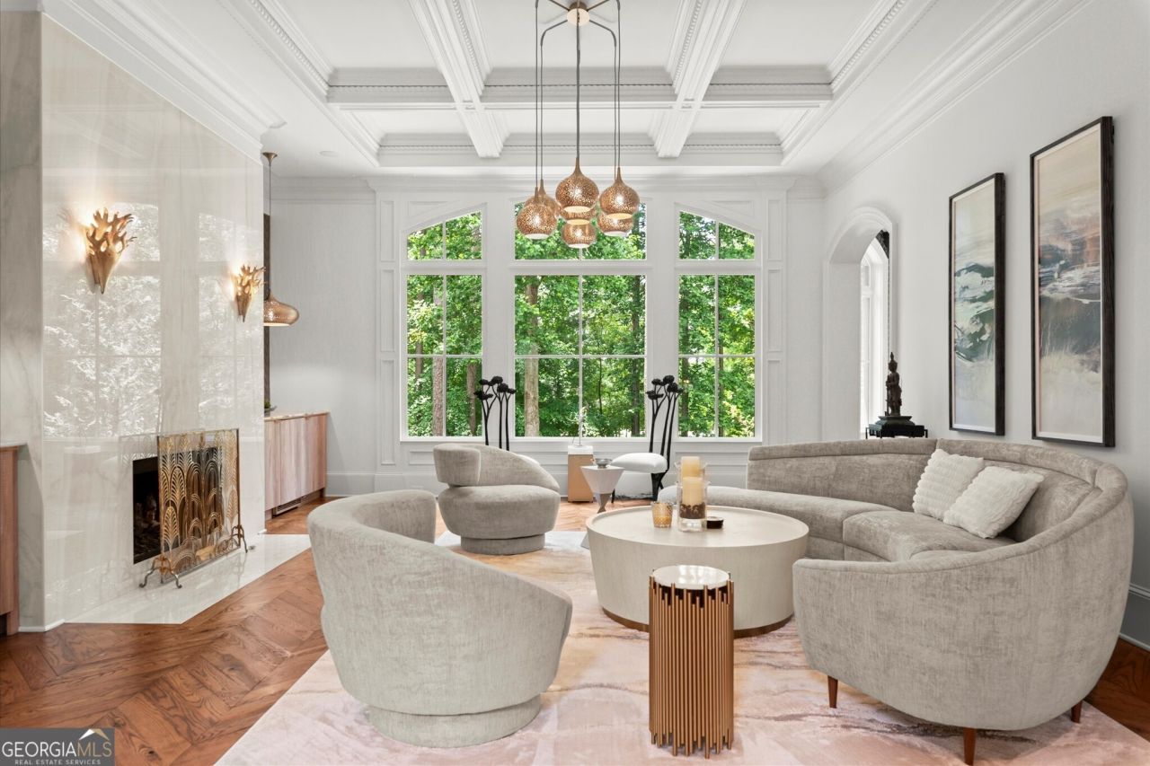 Welcome to The River Club, one of Metro Atlanta's most coveted gated communities, where timeless elegance meets unparalleled luxury. This custom-crafted masterpiece home was designed by the renowned Culver Builders and is perfectly positioned overlooking the lush fairways of the fourth hole on the Greg Norman-designed championship golf course offering breathtaking views and an unrivaled lifestyle. From the moment you step through the gorgeous double front doors, this residence captivates you with its sophisticated design and meticulous craftsmanship. The grand two-story foyer sets the tone with soaring barrel-vaulted ceilings, designer crystal chandeliers, and an exquisite curved staircase. To the left, a refined study with fireplace beckons with rich cherry wood-paneled walls, and architectural beams, creating an ideal private office or serene retreat. Entertain in style in the banquet-sized dining room adorned with a coffered ceiling and intricate millwork or gather in the expansive living room with a beautiful fireplace where chevron-patterned hardwood floors, a custom backlit entertaining bar, and a wall of windows showcases panoramic views of the meticulously landscaped yard which transforms into a magical oasis under evening lights. The gourmet chef's kitchen is a culinary haven featuring top-of-the-line Wolf and Sub-Zero appliances, a sprawling quartzite island, and exposed Chicago brick accents that add warmth and character. Seamlessly connected to a butler's pantry with dual wine coolers, Viking ice makers, and abundant storage, this space is designed for effortless hosting. The kitchen flows into a charming breakfast nook and cozy keeping room, anchored by a floor-to-ceiling stone fireplace and framed by French doors that open to a covered and vaulted fireside porch. This outdoor living space is complete with surround sound and is the perfect place for year-round al fresco dining and intimate gatherings. The main-level owner's retreat is a sanctuary of indulgence, boasting soaring coffered ceilings, a romantic fireplace, and a custom feature wall. Dual walk-in closets with bespoke shelving lead to a spa-inspired bathroom, complete with heated marble floors, dual vanities, a freestanding soaking tub, and an oversized frameless glass shower with multiple rain heads. Ascend to the second level, where four generously proportioned suites await, each with private en-suite bathrooms and expansive closets. One oversized suite features an attached private living area, ideal for teens, in-laws, or an au pair, offering versatility and comfort. The terrace level is an entertainer's paradise designed to impress with a speakeasy-inspired lounge featuring a handcrafted Brunswick bar, a climate-controlled wine cellar, a billiards room, and a dedicated shoeshine nook. The fireside media room opens to a private, fenced backyard, where a custom fire pit, covered patio, and lush landscaping create an intimate setting for outdoor relaxation. This level also includes space for a future home gym, guest suite, still with ample storage. Additional highlights include a private elevator servicing all three levels, a four-car garage and space for a golf cart, two laundry rooms, and smart-home technology controlling lighting, security, and climate. Nestled within The River Club, a certified Audubon Sanctuary is located along the banks of the iconic Chattahoochee River and offers access to world-class amenities including a Greg Norman-designed golf course,