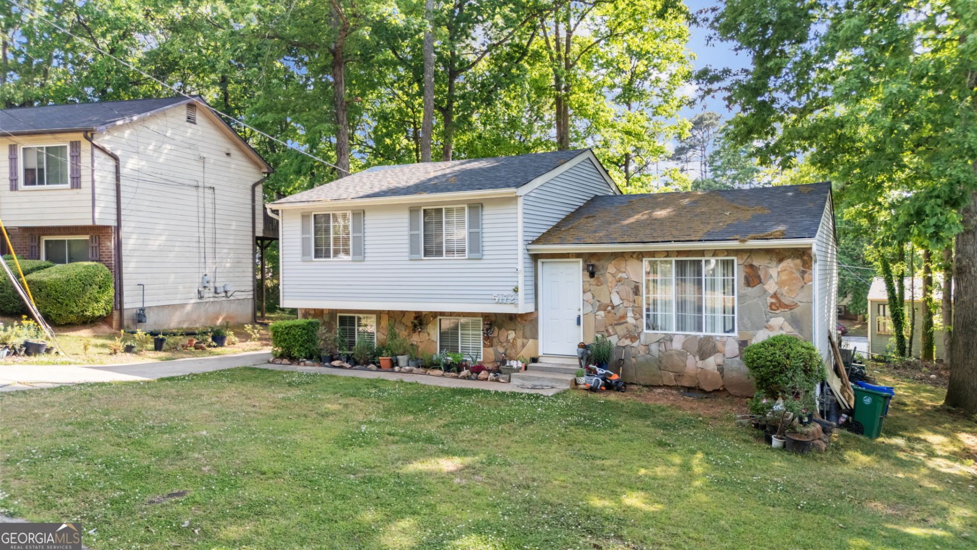 5-bedroom, 3-bathroom split-level in Scarbrough Square, Stone Mountain, DeKalb County. Fully updated kitchen, three renovated bathrooms, and a finished lower level with a separate entrance. Listed at $290,000 with no HOA. The main level opens to a vaulted great room with hardwood floors and recessed lighting. The renovated kitchen features gray shaker cabinets, granite countertops, a subway tile backsplash, pendant lighting, and a full stainless steel appliance suite including a gas range, French door refrigerator, built-in microwave, and dishwasher. A granite peninsula opens to the dining area, and a sliding glass door leads directly to the rear deck overlooking a wooded, tree-canopied backyard. The upper level includes three bedrooms with LVP flooring and ceiling fans. The primary suite connects to an en suite bathroom with a large-format marble-look tile walk-in shower and a double built-in niche. A second full bathroom on the upper level features a white marble tile walk-in shower with a mosaic tile floor and dual recessed niches. The lower level adds two additional bedrooms, a third full bathroom with a marble-look tile walk-in shower and mosaic tile floor, a dedicated laundry room with Samsung front-load washer and dryer, a Carrier HVAC system, and a flex room with a utility sink, LVP flooring, and a separate exterior door. Ideal for multigenerational living, a home office, or additional living space. The stone and vinyl exterior includes a rear deck with stair access, a covered lower-level entry with a gabled roof overhang, patio space, and a concrete driveway set on a mature, tree-covered lot with Stone Mountain Park visible on the horizon. Roof and HVAC both replaced within the past 2 years. Located in DeKalb County minutes from Stone Mountain Park and the Covington Highway corridor, with access to I-285 for commutes across metro Atlanta.