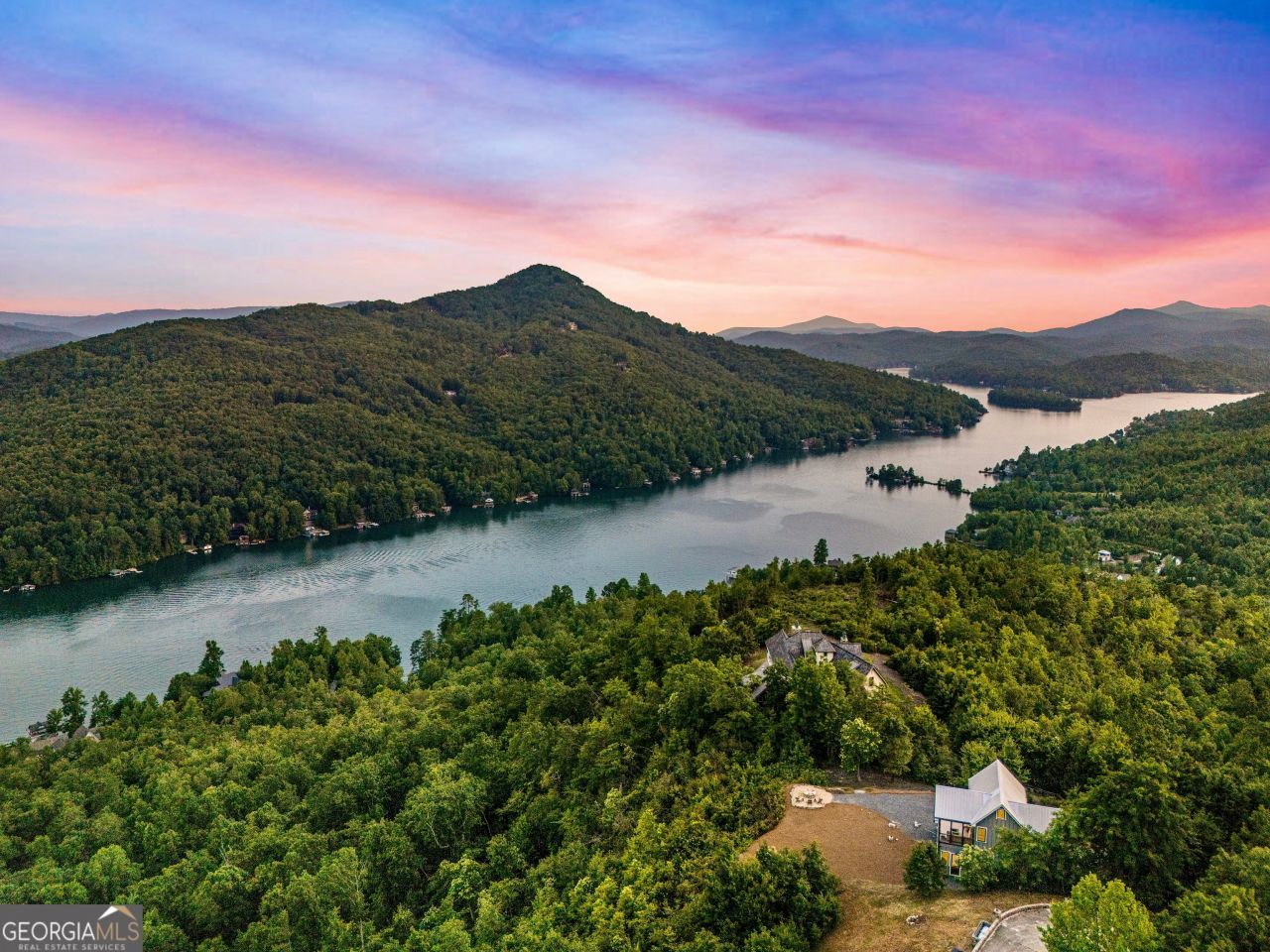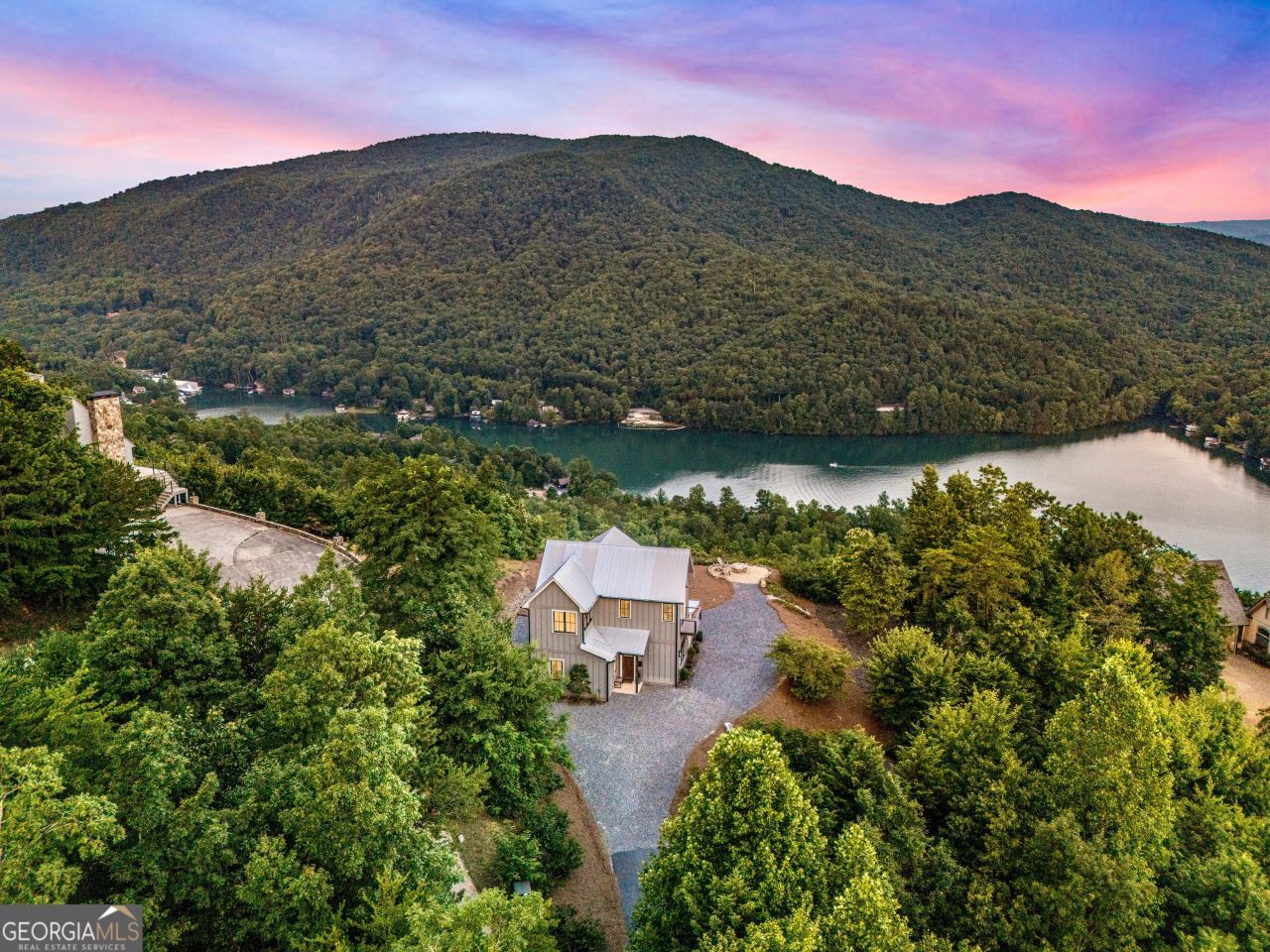Located in exclusive Goat Cliff Estates, this 3-Bedroom + Loft, 2-Bathroom home offers a rare opportunity to own a piece of North Georgia paradise (fee-simple) with deeded lake access and dock house. This home has one of the best views of all of Lake Burton, and 300 square feet of custom decks for additional outdoor living (1,856+300 = 2,156 sq. ft*). Designed to embrace the outdoors, this elegant mountain retreat boasts sweeping layered mountain vistas and spectacular sunrise and sunset views overlooking Lake Burton. Step inside to an open-concept living area with high ceilings (10, 14+ throughout), large picture windows, and warm wood accents that create a sense of comfort and grandeur. The well-appointed kitchen opens seamlessly to the living and dining spaces, perfect for entertaining guests with a large seven-foot island and custom-built cabinetry. The spacious primary suite offers a private sanctuary with stunning views, a spa-like bathroom including a large overhead rain shower, and soaking tub with sunset views. Two guest bedrooms on the main level provide ample room for family or visitors. Outside, enjoy a porch that's ideal for morning coffee with incredible long mountain views or enjoy sunset cocktails while sitting around the masonry outdoor fire pit overlooking the lake. As part of the Goat Cliff Estates community, residents enjoy shared deeded lake access and a dock house, allowing for boating, kayaking, and lakeside recreation. With its unmatched views, and convenient location only minutes from Waterfall Club, Anchorage Boat Dock and the amenities of Downtown Clayton, 714 Sonya Road is a rare gem in the Lake Burton market (on the preferred north end of the Lake) whether you're seeking a luxurious full-time residence or a weekend escape.