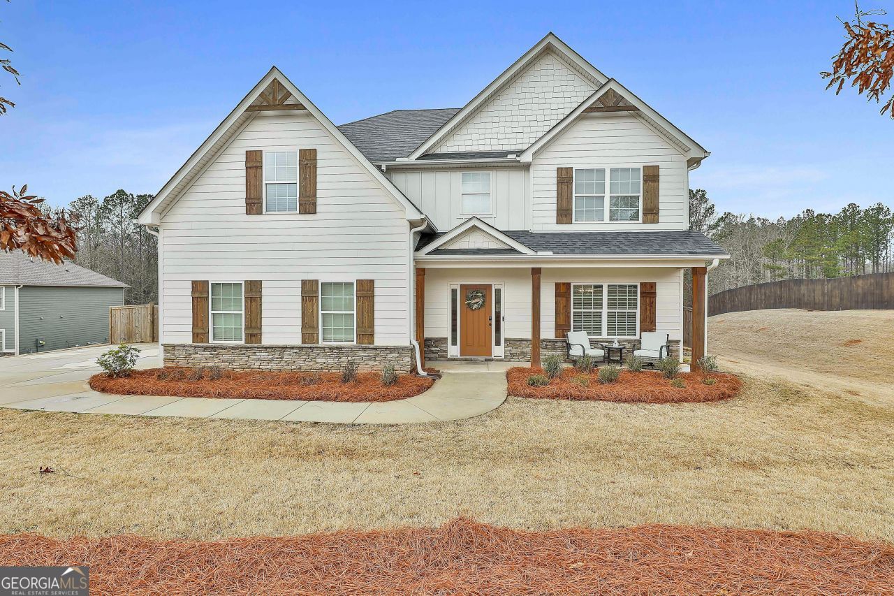 Welcome to one-acre living done right! Tucked inside Senoia's Drayton Farm community, this beauty starts strong with a guest suite on the main level...full bath included-your guests may never leave! The spacious great room brings cozy vibes with a wood-burning fireplace and flows right into a show-stopping kitchen featuring a large island, walk-in pantry, tons of cabinetry, stainless steel appliances, and a freestanding gas range ready for your inner chef. The owner's entry keeps life organized with built-in cubbies for shoes, coats, and hats. Perfect to keep everyone organized after work, school, or extracurricular activities. Treat your guests in the formal dining room dressed up with beautiful coffered ceilings and wainscoting. Upstairs, escape to the indulgent owner's suite complete with a sitting area, oversized walk-in closet, double vanities, tiled shower with bench, and a separate garden tub made for soaking the day away. Laundry is conveniently upstairs, along with three additional bedrooms and a full hall bath. Beautiful large plank, engineered hardwoods are all throughout the main level. And the cherry on top? Retreat to the sophisticated back porch including a ceiling fan and wood-burning fireplace. It's already set up to enjoy movie night or your favorite team. It is sure to be your favorite spot! You don't want to miss this one. Reach out to schedule your showing today!
