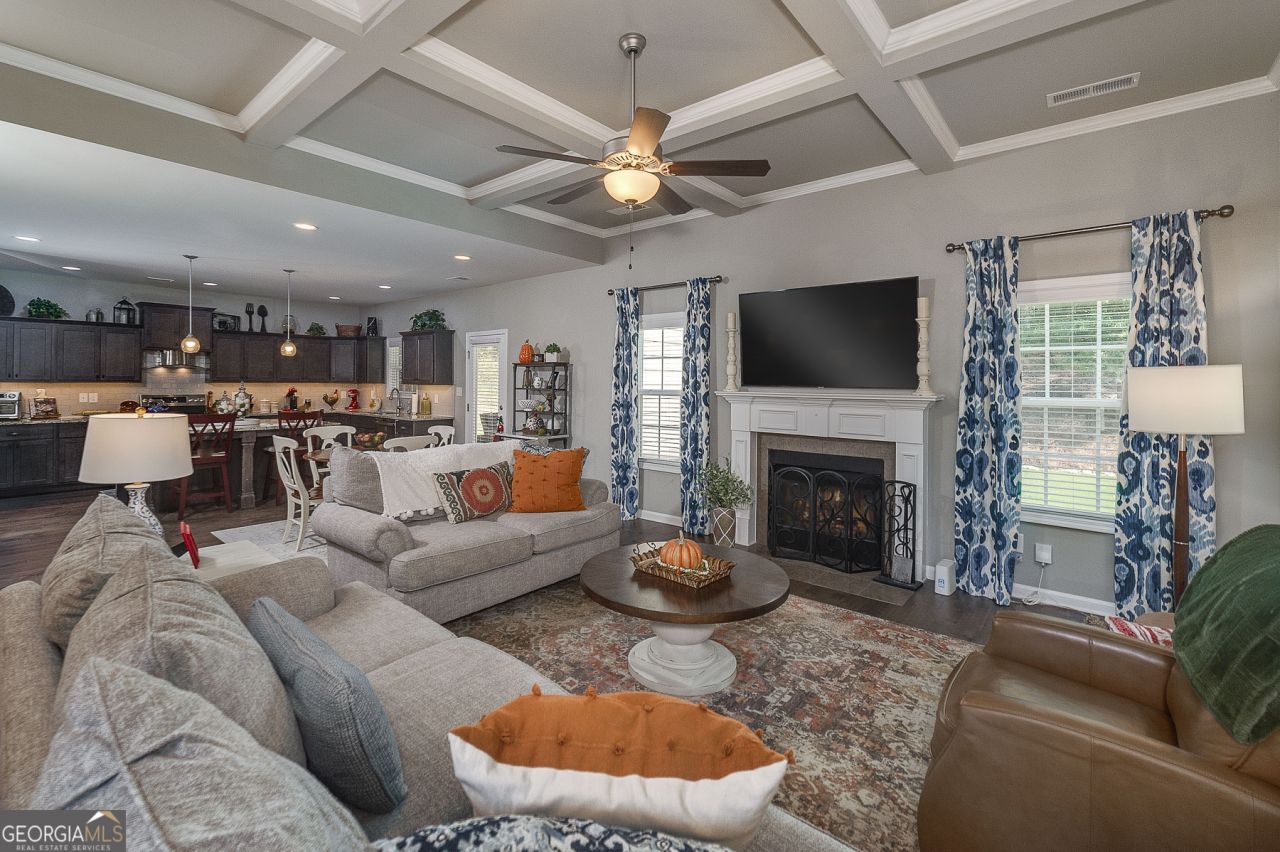 Welcome home to Parkside Village! This gorgeous 4 bed, 3.5 bath home features an open kitchen with updated appliances and great room, spacious owner's suite on the main level including a custom built closet, mud room with drop zone, upgraded rear game day porch with tile floor and stone fireplace, perfect for watching your favorite sports team or enjoying a morning cup of coffee. Upstairs you'll find 3 additional bedrooms, 2 full bathrooms, one with dual vanities, and a large media room/flex room. The HOA maintains the yard, all you have to do is enjoy the amazing amenities, including a huge community pool and kids playground! Parkside Village is in a great location, just minutes from shopping, dining, Piedmont Newnan Hospital and I-85. Don't miss the opportunity to view this beautiful home in a wonderful neighborhood.