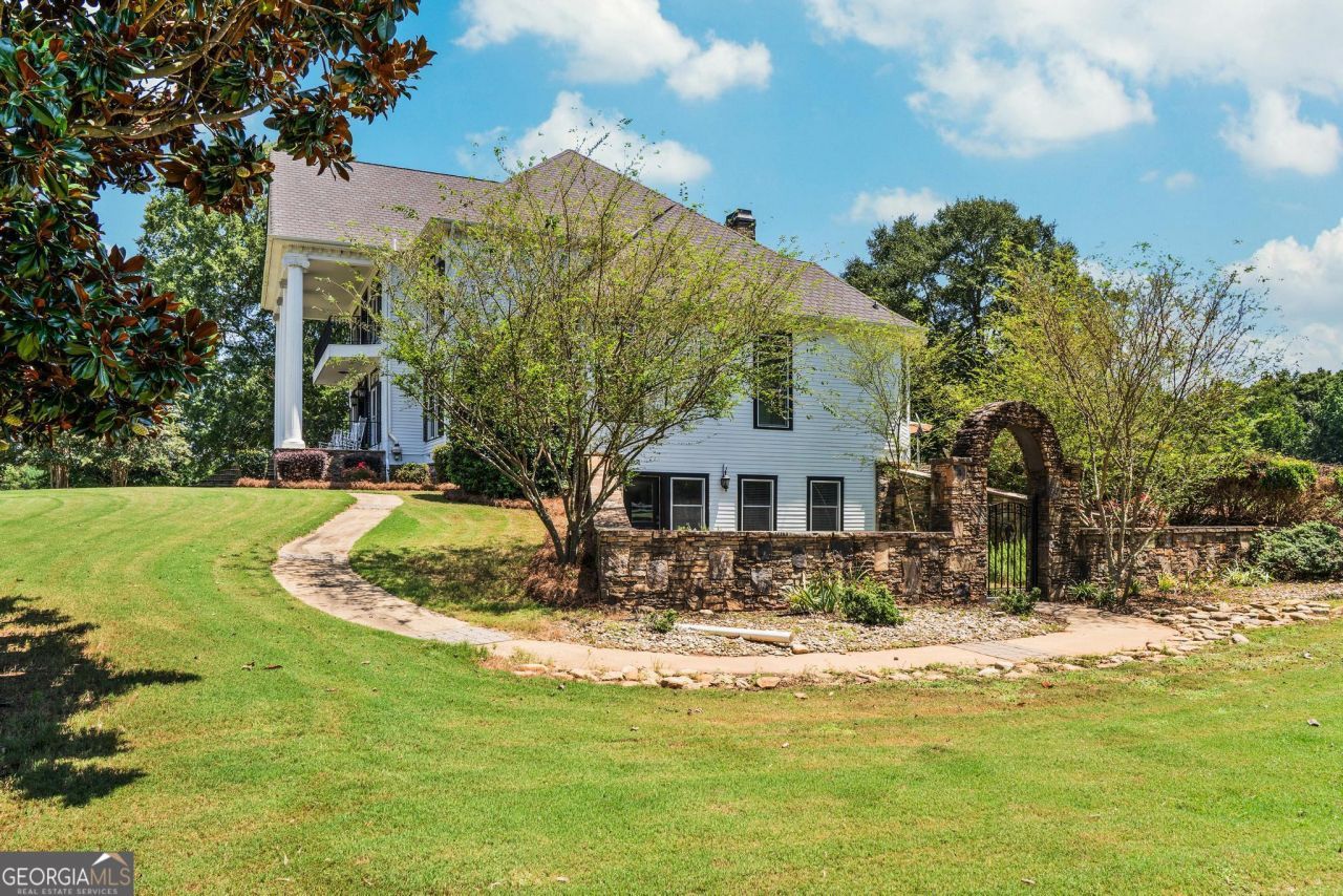 The Riesen Ranch is a remarkable 191+ acre cattle and equestrian estate, perfectly situated just one hour from downtown Atlanta. It boasts exceptional beauty while also serving as an income-producing livestock ranch and event venue. The custom-built main house was designed for family and entertaining. This 6-bedroom, 4.5-bath home offers 9,247 square feet of living space, including a fully finished 2,264-square-foot basement with a mother-in-law suite. The home showcases the finest craftsmanship and detail. A large front porch overlooks the pond and pasture. Inside, the grand foyer features a double bridal staircase with beautiful flooring, ceiling accents, and custom woodwork. It leads to a spacious living room with a fireplace and stunning views of the heated pool and pastures. The breakfast room, also with a fireplace, connects to a newly renovated kitchen. A large mudroom, ideal for farm life, leads to a large laundry room. At the front of the house, the formal dining room and office boast breathtaking pond and pasture views. The master suite includes a private study with a gas fireplace. The expansive master bath offers a glass shower, jacuzzi tub, and his-and-hers toilets. Upstairs, there are four bedrooms-two on each side of the home-joined by Jack-and-Jill bathrooms and a balcony overlooking the pond and property. The fully finished basement features a private mother-in-law suite with a kitchenette and separate entrance leading to a tea garden. Additional highlights include a home theater with custom sound, lighting, seating, and soundproof walls, as well as a secure gun room with keypad access, storage rooms, and ample closets. The home is equipped with a whole-house central vacuum system and a Generac emergency generator. Outside, there are two two-car garages. One is connected by a breezeway that leads to a large deck and heated pool overlooking the pasture. A 3,500-square-foot shop includes a finished office on one side and a music recording studio with a sound room on the other. The concrete-floored shop houses the family's gym and rock wall, with plenty of space for equipment and toys. It also features a tool room with a workbench, loft storage on both sides, and additional outdoor bays for storage. The property includes two horse barns. One with seven custom pine stalls, a feed room, tack room, storage closets, a hay loft with chute, fans, lighting, and an attached paddock for easy turnouts that lead to a large pasture. The second barn offers eight stalls with feed and tack rooms. Above it is a newly renovated 2-bedroom, 1-bath apartment with a full kitchen and large living area-perfect for hosting and entertaining. A riding arena and round pen provide space for equine training and exercise. The ranch also features a 10,000-square-foot elegant event space adorned with imported crystal chandeliers. It includes a commercial prep kitchen with stainless steel preparation station, refrigerator, and sink; three restrooms; a live-edge bar; and seating for up to 200 guests. Outdoor amenities include a stage and seating area, ideal for weddings, educational gatherings, and corporate events. The Riesen Ranch offers a gated entrance, a well-maintained road system, and trails throughout the property. Two 4,000-square-foot red iron open barns provide equipment storage. The property is fully fenced and cross-fenced, with multiple paddocks and pastures. Currently raising the family's Wagyu cattle and horses, the ranch offers tremendo